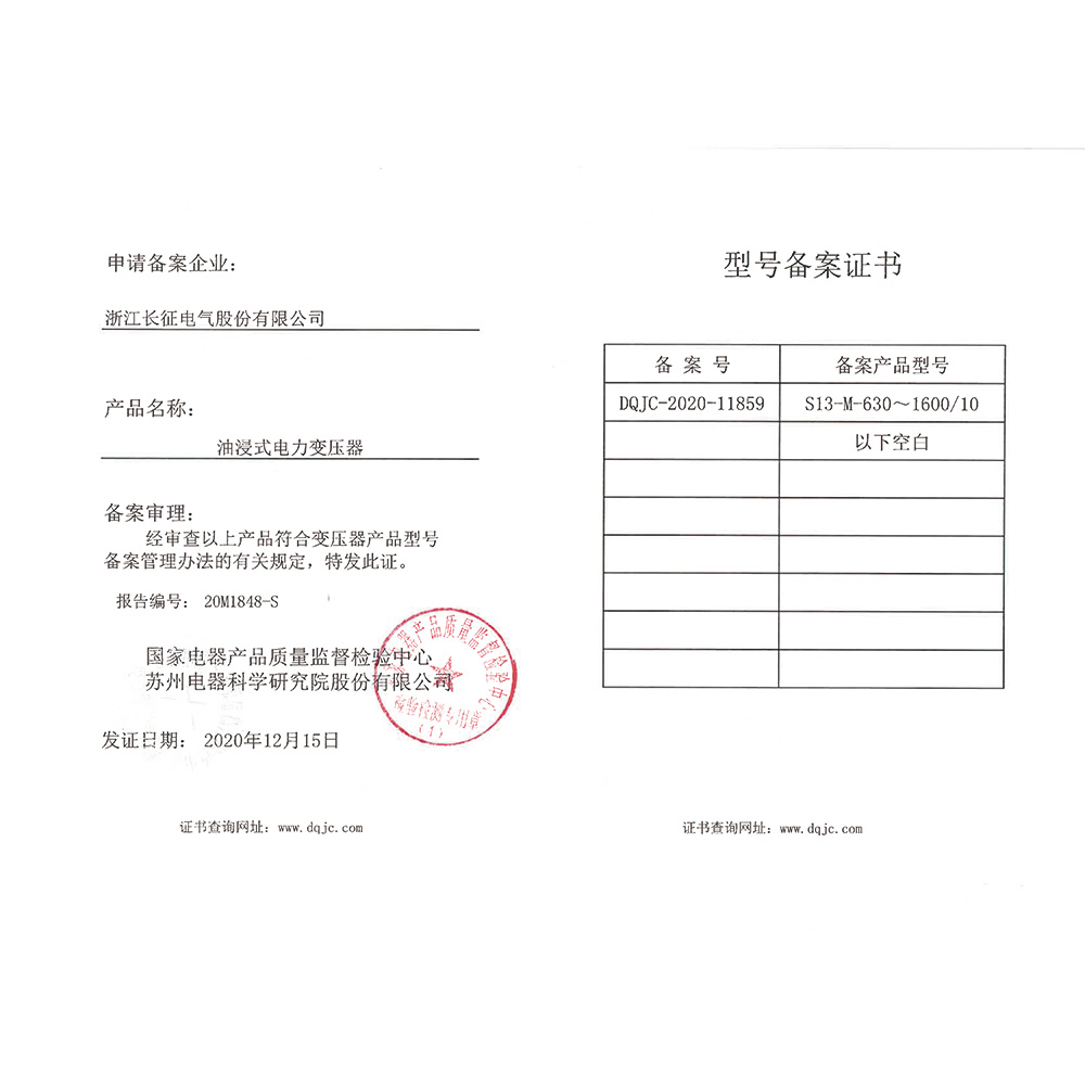 S13-M-630~1600/10油浸式電力變壓器 型號(hào)備案證書