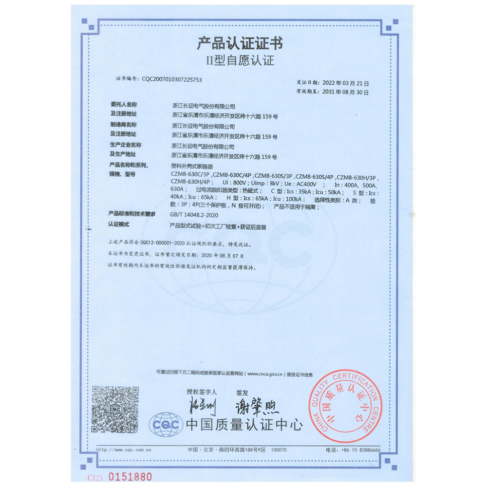 CZM8塑料外殼式斷路器 產(chǎn)品認(rèn)證證書